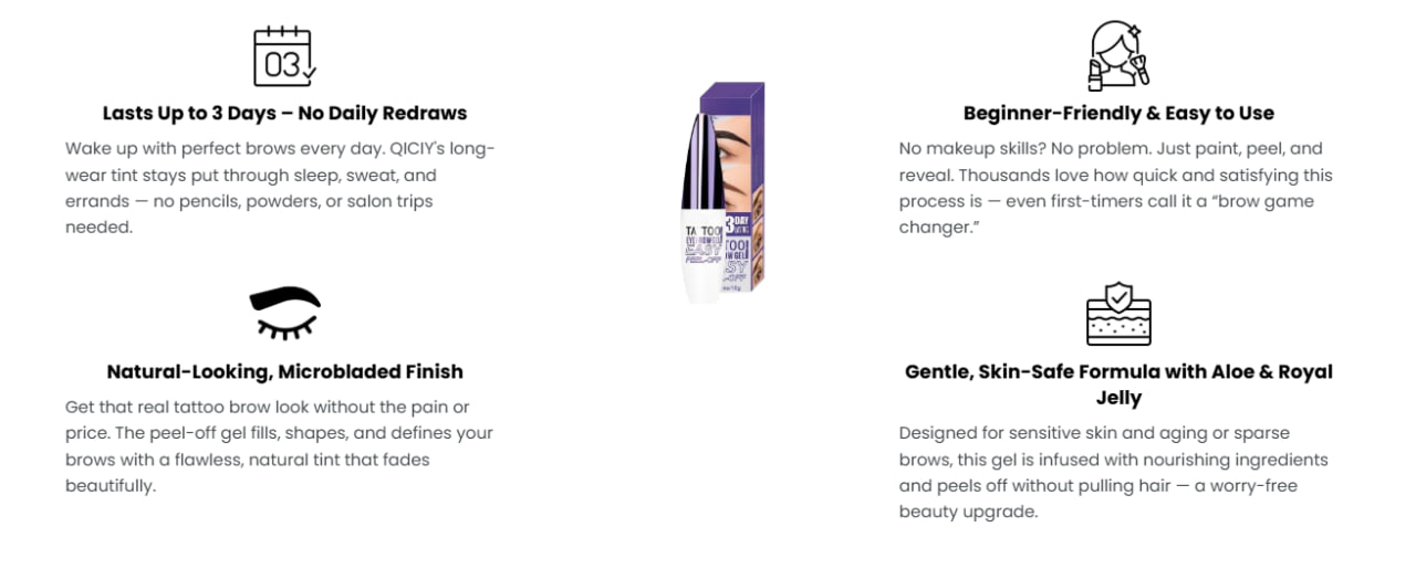 Our promise? Creating brows you'll actually love waking up to — thanks to the Peel-Off Tattoo Eyebrow Gel, backed by a 30-day satisfaction guarantee and a beauty routine that finally makes sense. No pain, no commitment, just peel and reveal.
